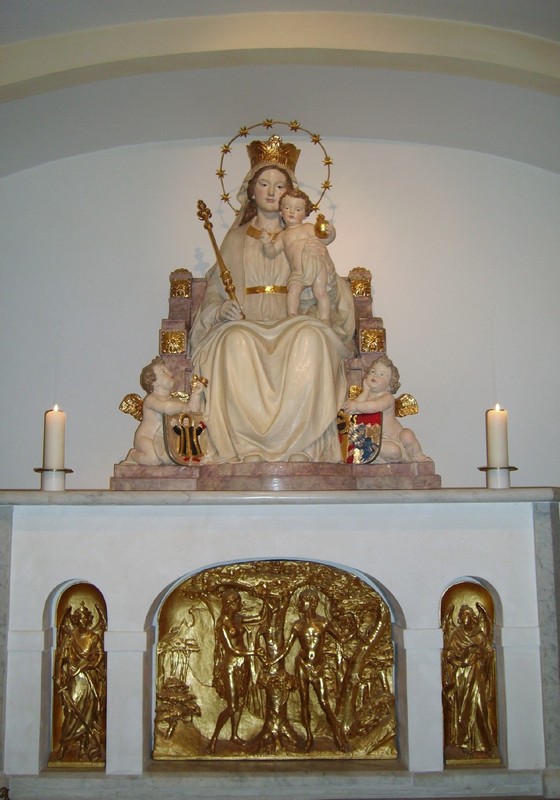 Auf dem ehemaligen Hochaltar ist – wie schon an der Fassade – die Gottesmutter zu sehen. Durch Krone, Zepter und den Kranz von zwölf Sternen ist sie als Himmelskönigin dargestellt. Auf ihrem Knie steht ihr Sohn Jesus als Salvator mundi, der die Menschen von der Erbsünde erlöste. Auf der Vorderseite des Altars ist der Sündenfall Adams und Evas im Paradies dargestellt. Die Plastik wurde um 1925 von Franz Drexler geschaffen. Zu Füßen der Madonna halten zwei Engelputti die Wappenschilder der Stadt München und des Landes Bayern.
